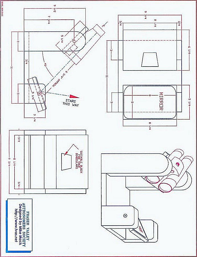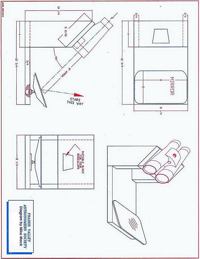 c) Side supports for bino box is 10" high where as the mirror supports are 3" high and about 2 to 3" wide, 1/2" or 3/4" thick. Support board for binoculars is 10 1/2" wide (just like the mirror support) enough to rest binocs - rest at front can be a 1 1/2" square block, for the front swivel of the binocs to rest on ( mounted close to the inside of the binoc support board) Only needs adjustment if other family members have different-size binocs or different widths between their eyes. Usually not necessary. Hope all this helps.